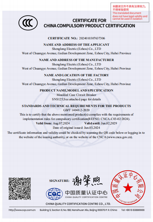 SNS125, SNS250 L/M/H type, SNS400,SNS630 L/M/H type thermal magnetic type and the above specifications four pole neutral pole type A, B circuit breakers can be with "thermal overload alarm without tripping" function to ensure power supplycontinuity and meet the requirements of Article 6.3.6 of GB50054.