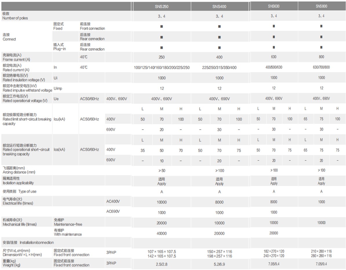 SNS electronic circuit breaker has overload long delay inverse time, short circuit short delay inverse time, short circuit short delay fixed time, short circuit instantaneous, undervoltage protection and phase protection function (optional). Among them, the controller with communication interface can be "four remote", to achieve parameter modification, fault reading to meet the requirements of the control center and automation system. There are 125M/H type, 250M/H type, 400M/H type, 630M/H type, 800M/H type five shell frame, current from 12A to 800A.