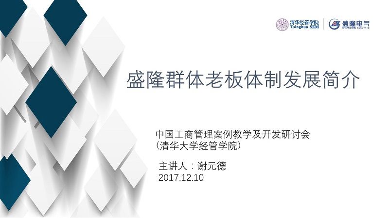 12月10日上午,“2017年冬季中國工商管理案例教學及開發研討會”在清華大學經管學院偉倫樓舉行。盛隆電氣集團董事長謝元德受邀以《盛隆群體老板體制發展簡介》為主題發表演講。來自清華大學、復旦大學等全國各地高校近200名經管專業的教授、學者參加。