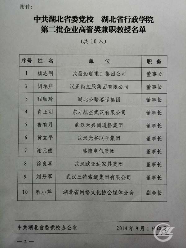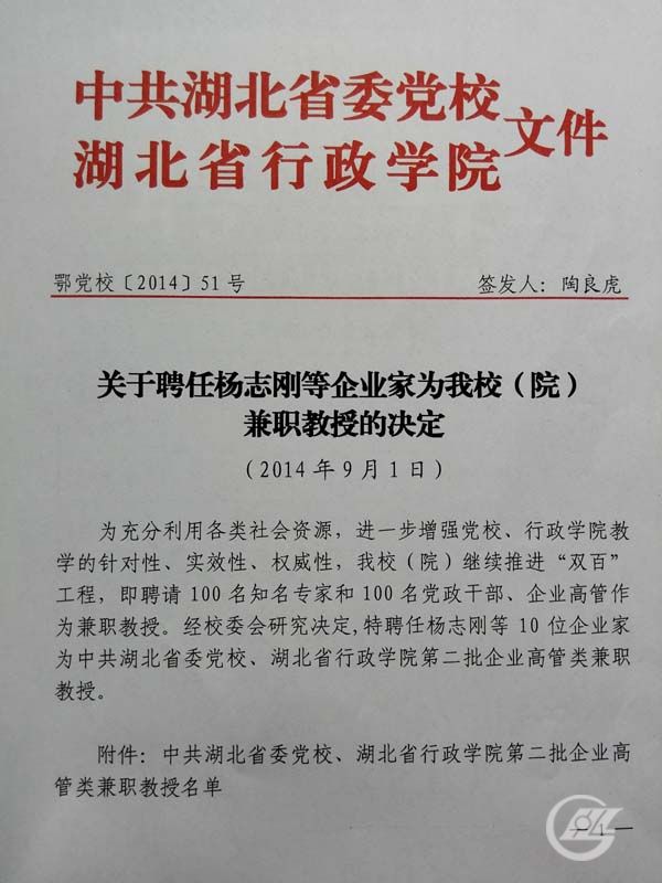 近日,中共湖北省委黨校、湖北省行政學院聘董事長謝元德為兼職教授。