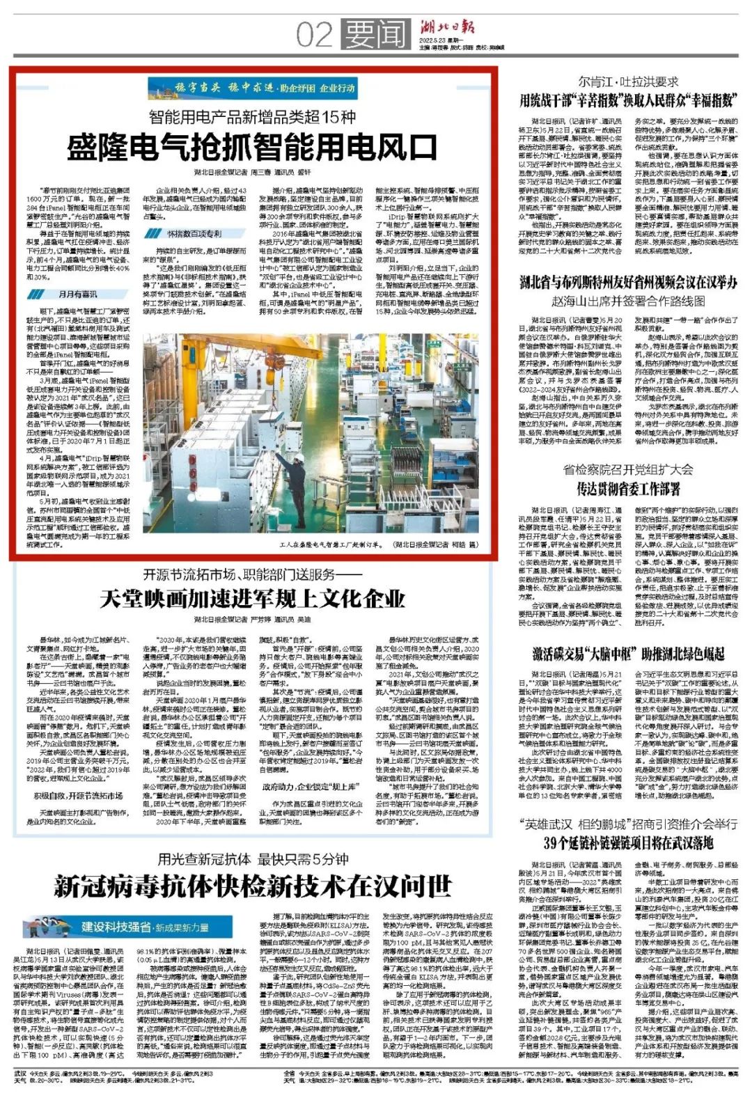 湖北日報訊(記者周三春)“春節前剛剛交付完比亞迪集團1600萬元的訂單。現在,新一批284臺iPanel智能配電柜正在車間緊鑼密鼓生產。”光谷的盛隆電氣智慧工廠總經理劉明陽介紹。得益于在智能用電領域的持續積累,盛隆電氣扛住疫情沖擊、經濟下行壓力,訂單量持續增長。統計顯示,前4個月,盛隆電氣的電氣設備、電力工程合同...2022-05-23 -