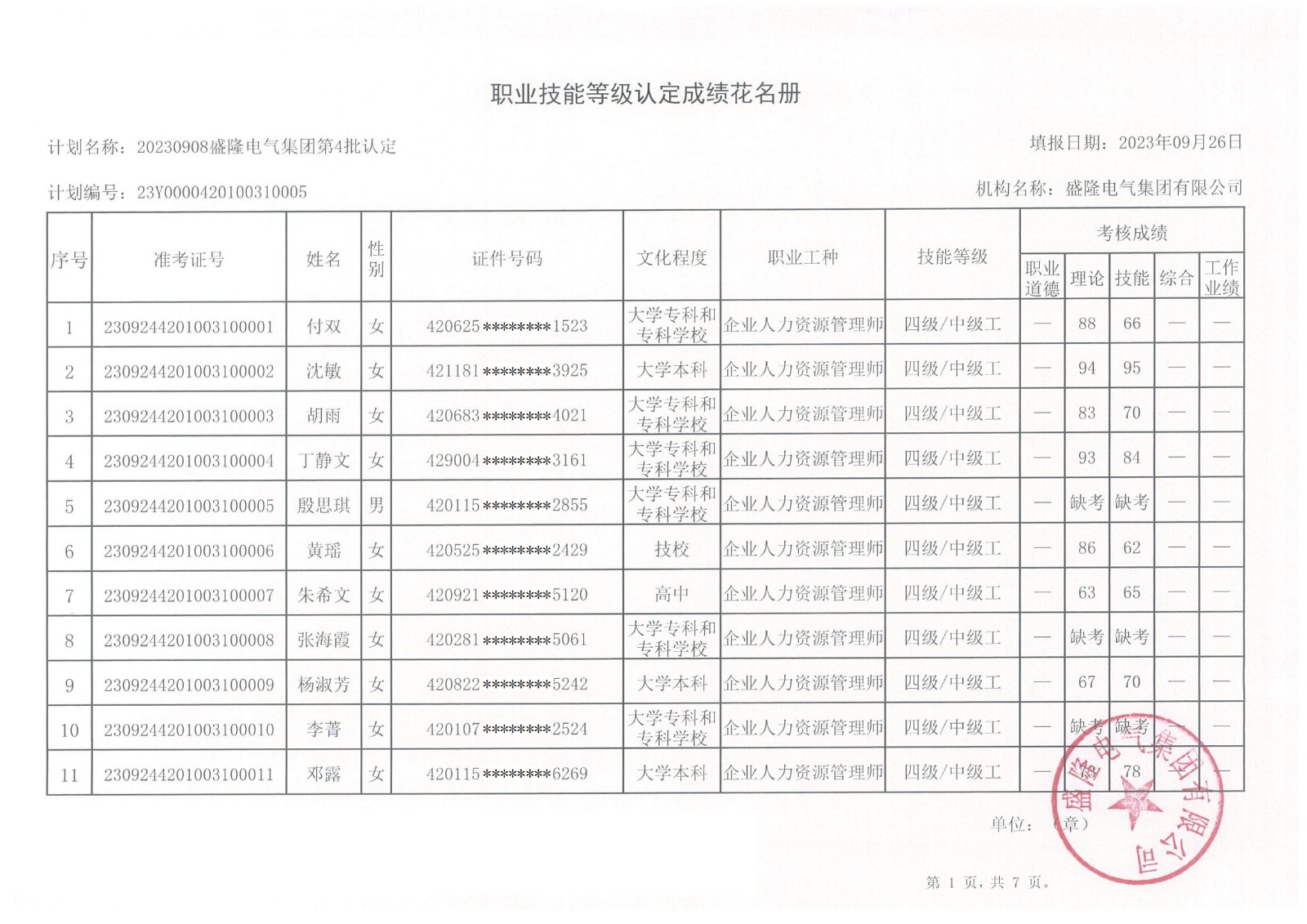 盛隆電氣集團2023年第六批職業技能等級認定成績公示